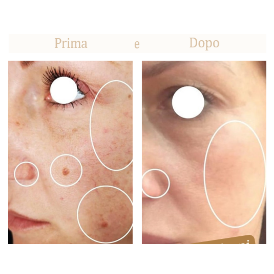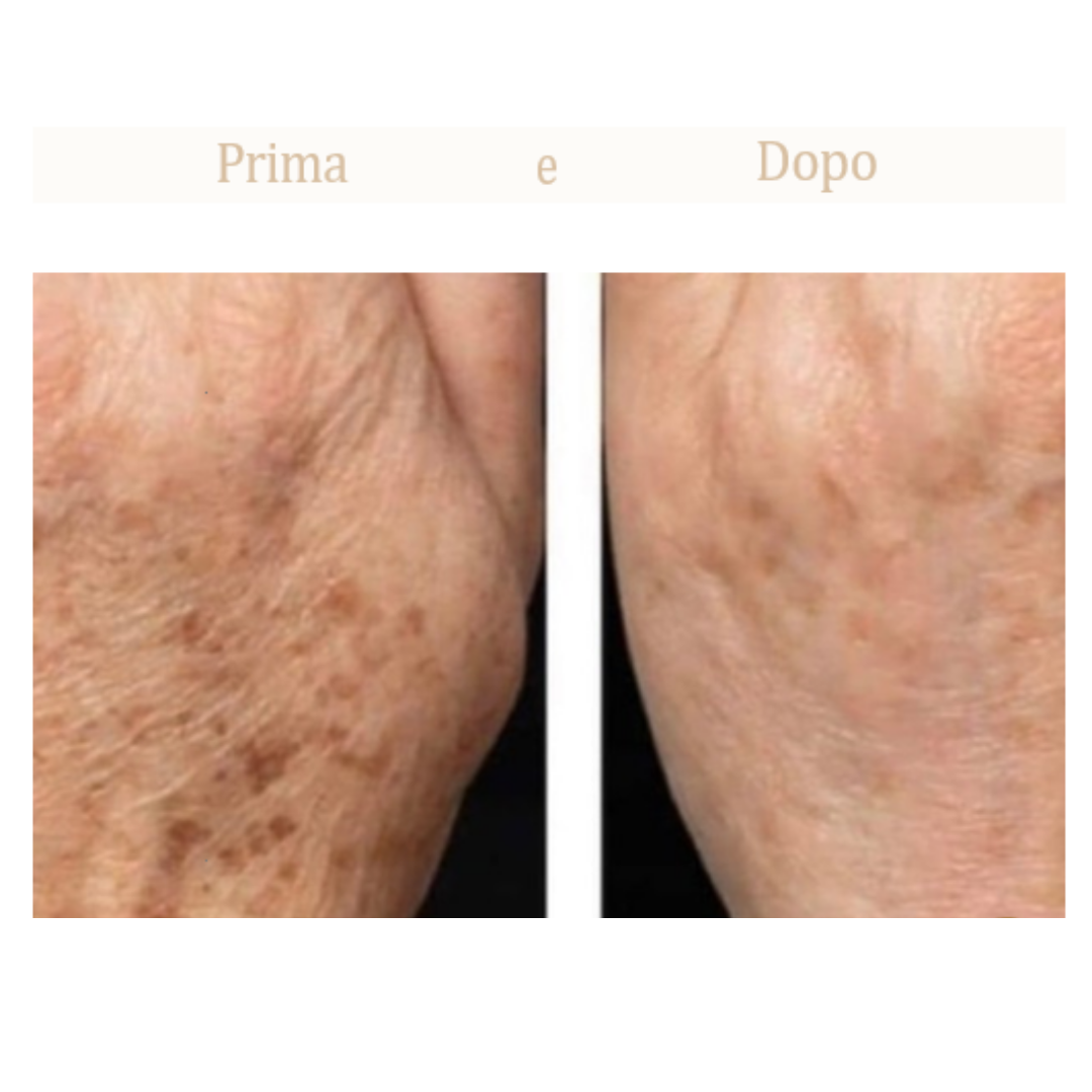 Riduce le macchie e discromie di diversa natura. Riduce il numero e l’intensità di quelle già presenti, impedisce la formazione di nuova iperpigmentazione e riduce il colorito grigio/giallastro, rendendo la pelle omogenea e luminosa.