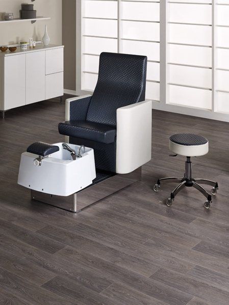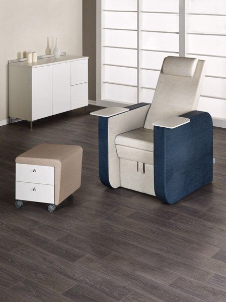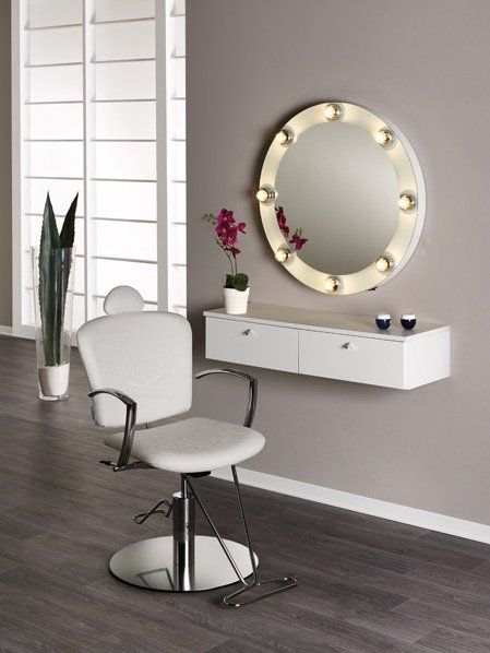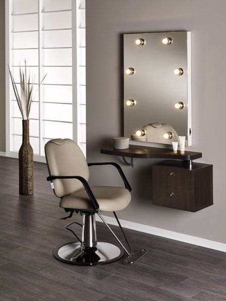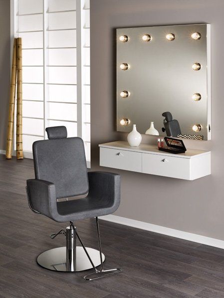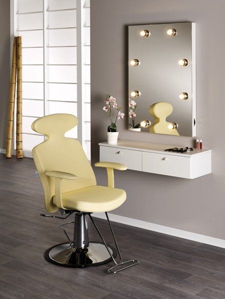 Postazioni makeup, specchi retroilluminati e set poltrona e sgabello per pedicure.